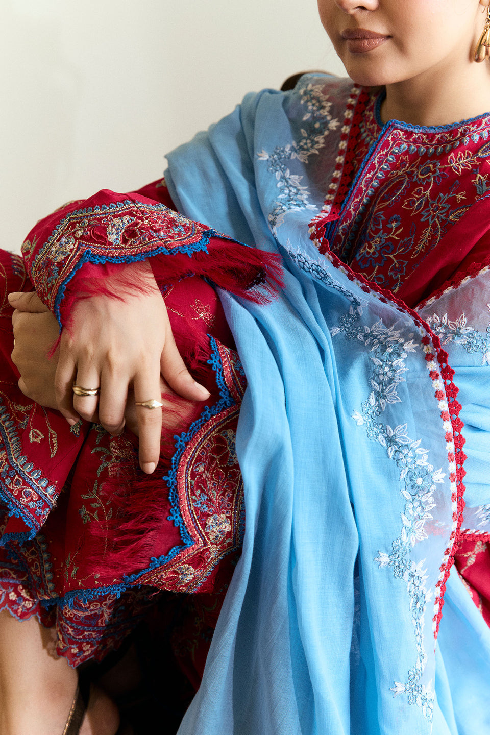 A maroon red canvas brought to life with sky blue embroidery and airy organza borders—this...