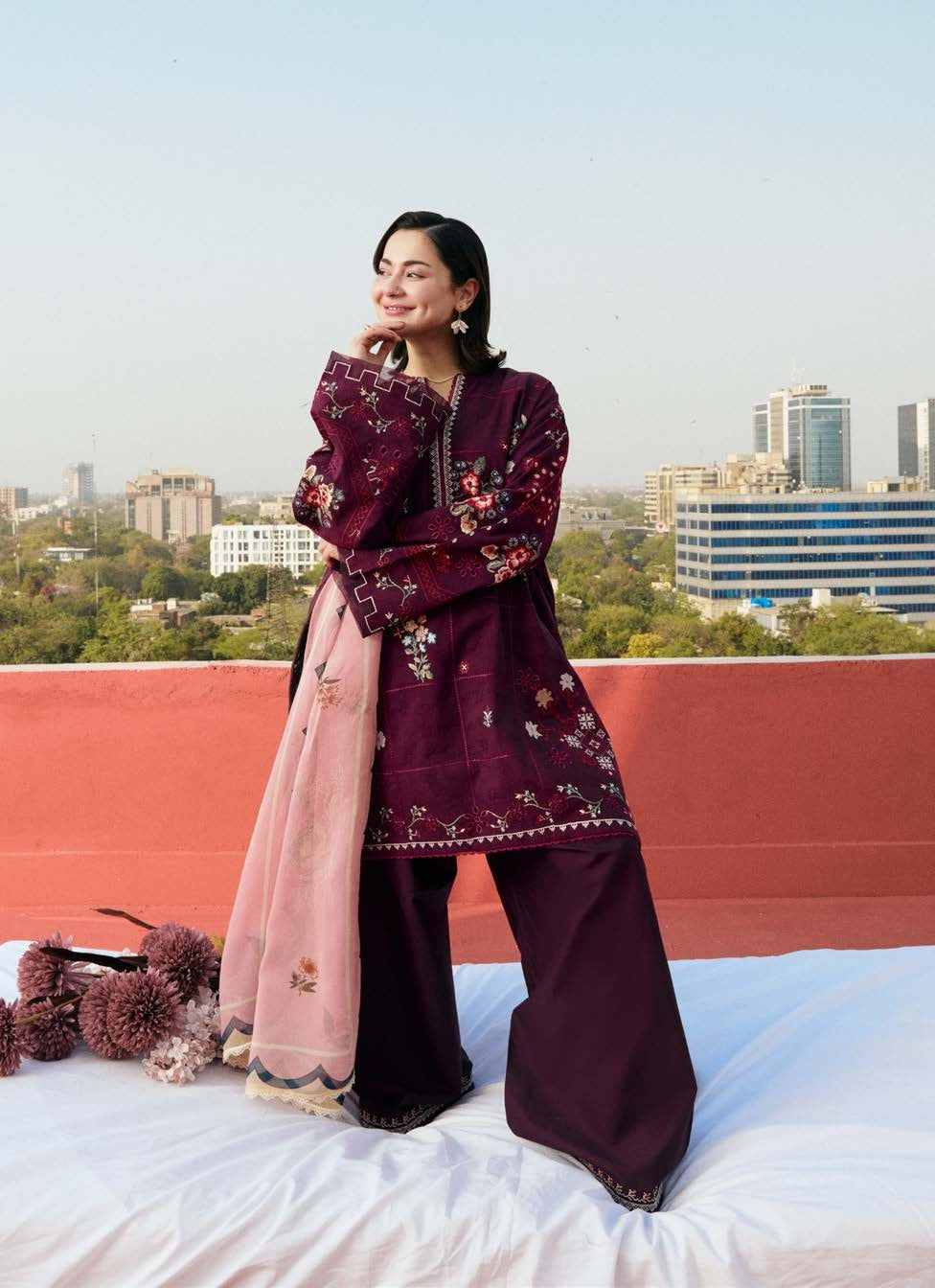 A rich plum hue with jacquard embroidery in floral motifs, paired with a soft chiffon dupatta...