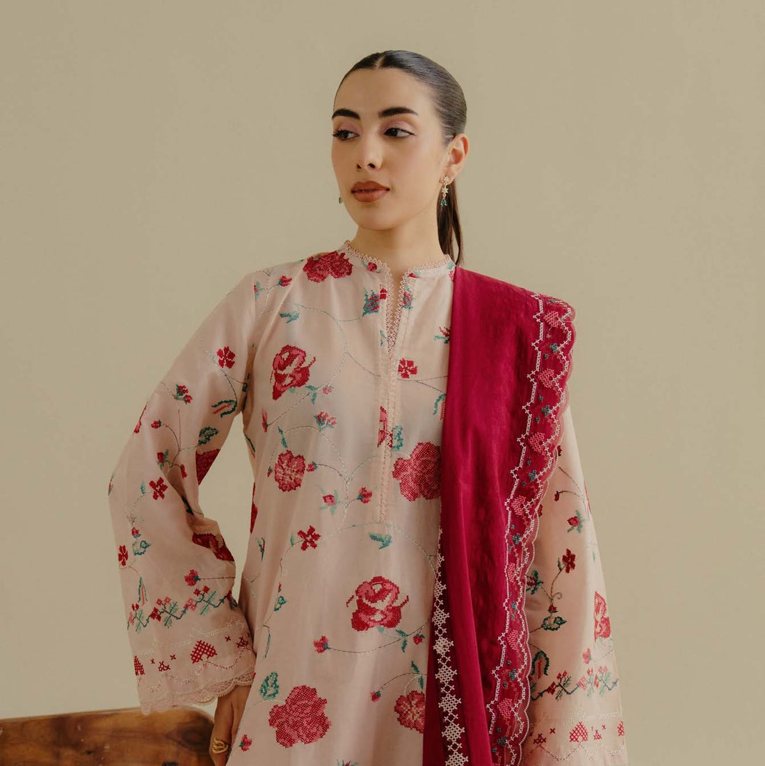A soft lawn base, paired with a flowing chiffon dupatta, is elevated by subtle pastel detailing...