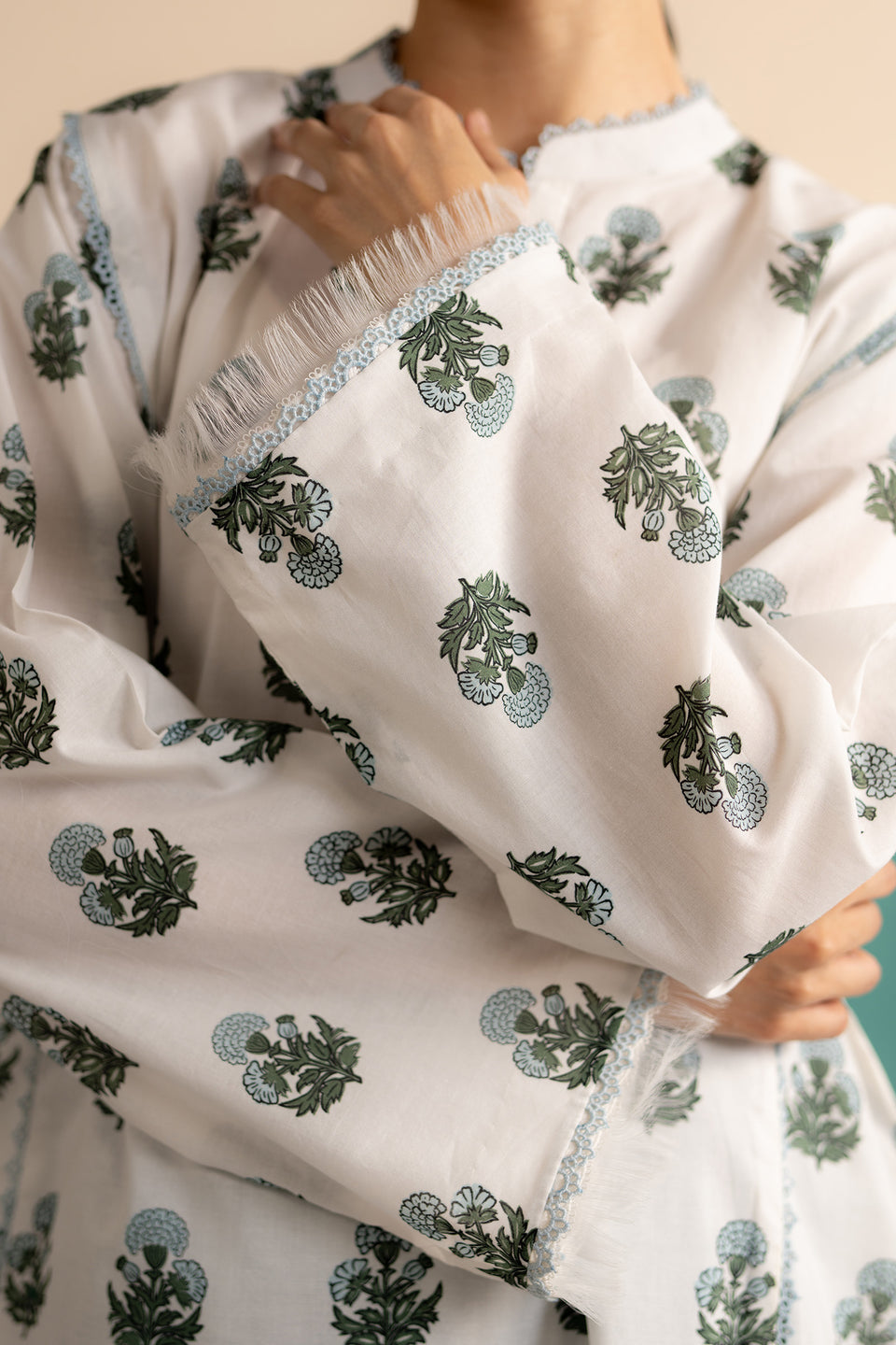 An off-white block printed inspired shirt with colonial aqua trouser, paired with a light chiffon dupatta—cool tones with an effortless vibe.