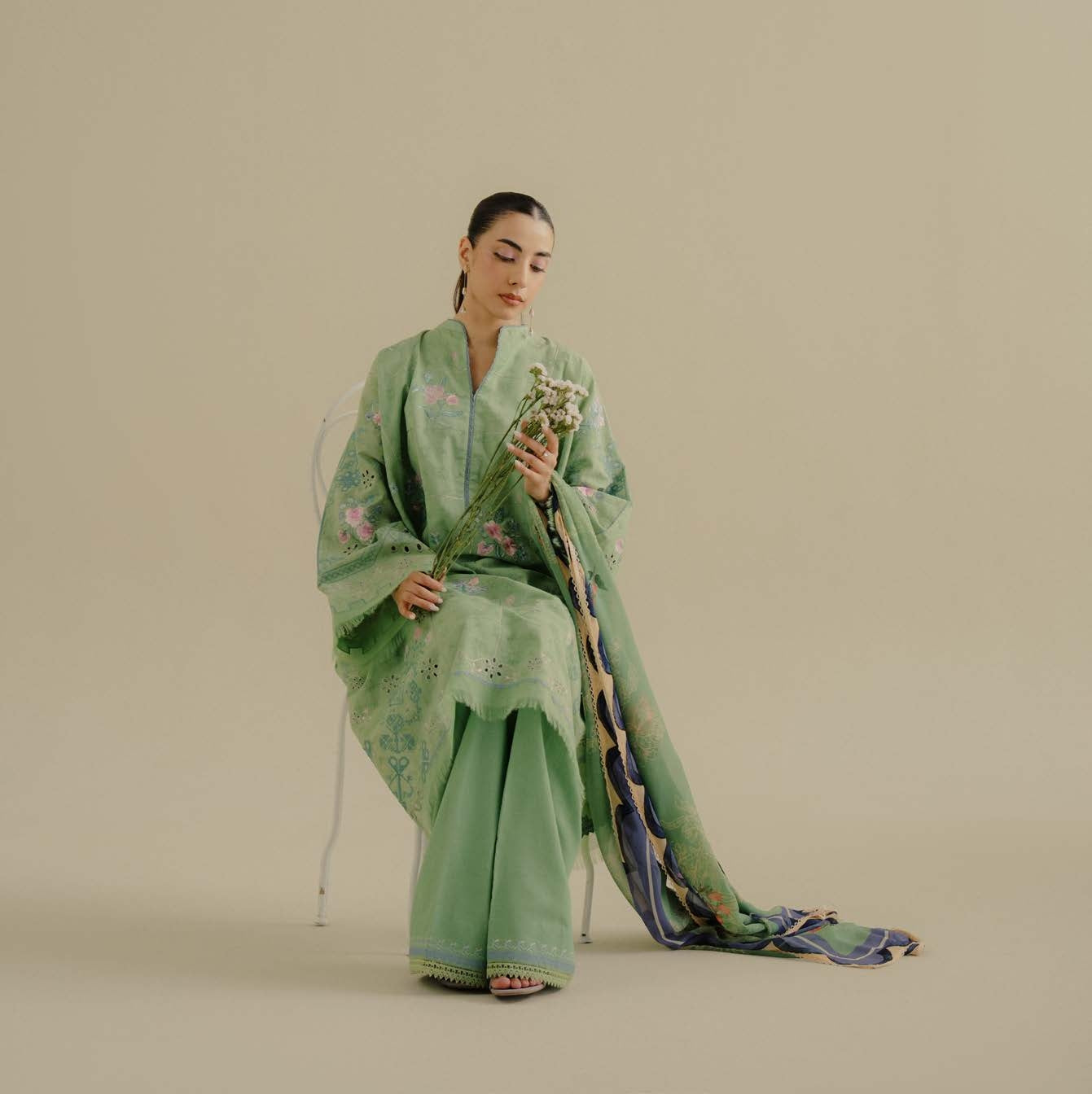 and an airy chiffon dupatta creates a serene, textured ensemble.